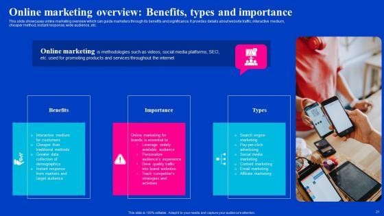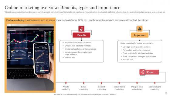 This slide showcases online marketing overview which can guide marketers through its benefits and significance. It provides details about website traffic, interactive medium,cheaper method, instant response, wide audience, etc. Create an editable Online Marketing Overview Benefits Types And Importance Viral Video Outreach Plan Elements Pdf that communicates your idea and engages your audience. Whether you are presenting a business or an educational presentation, pre-designed presentation templates help save time. Online Marketing Overview Benefits Types And Importance Viral Video Outreach Plan Elements Pdf is highly customizable and very easy to edit, covering many different styles from creative to business presentations. Slidegeeks has creative team members who have crafted amazing templates. So, go and get them without any delay. This slide showcases online marketing overview which can guide marketers through its benefits and significance. It provides details about website traffic, interactive medium,cheaper method, instant response, wide audience, etc.