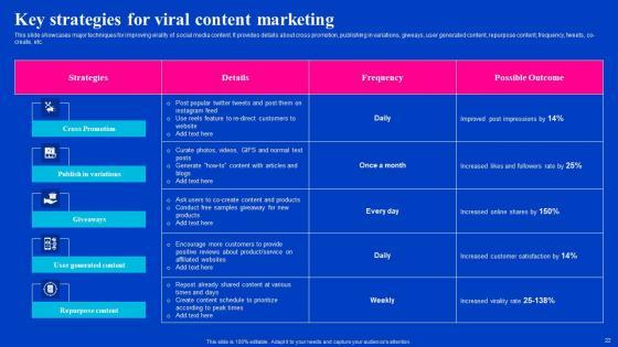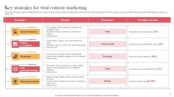 This slide showcases major techniques for improving virality of social media content. It provides details about cross promotion, publishing in variations, giweays, user generated content, repurpose content, frequency, tweets, co-create, etc. This Key Strategies For Viral Content Marketing Viral Video Outreach Plan Formats Pdf from Slidegeeks makes it easy to present information on your topic with precision. It provides customization options, so you can make changes to the colors, design, graphics, or any other component to create a unique layout. It is also available for immediate download, so you can begin using it right away. Slidegeeks has done good research to ensure that you have everything you need to make your presentation stand out. Make a name out there for a brilliant performance. This slide showcases major techniques for improving virality of social media content. It provides details about cross promotion, publishing in variations, giweays, user generated content, repurpose content, frequency, tweets, co-create, etc.