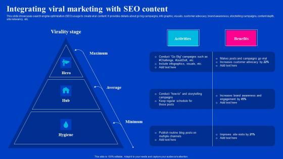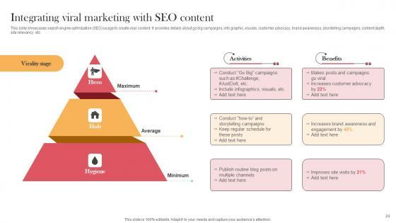 This slide showcases search engine optimization SEO usage to create viral content. It provides details about go big campaigns, info graphic, visuals, customer advocacy, brand awareness, storytelling campaigns, content depth, site relevancy, etc. Here you can discover an assortment of the finest PowerPoint and Google Slides templates. With these templates, you can create presentations for a variety of purposes while simultaneously providing your audience with an eye-catching visual experience. Download Integrating Viral Marketing With SEO Content Viral Video Outreach Plan Themes Pdf to deliver an impeccable presentation. These templates will make your job of preparing presentations much quicker, yet still, maintain a high level of quality. Slidegeeks has experienced researchers who prepare these templates and write high-quality content for you. Later on, you can personalize the content by editing the Integrating Viral Marketing With SEO Content Viral Video Outreach Plan Themes Pdf. This slide showcases search engine optimization SEO usage to create viral content. It provides details about go big campaigns, info graphic, visuals, customer advocacy, brand awareness, storytelling campaigns, content depth, site relevancy, etc.