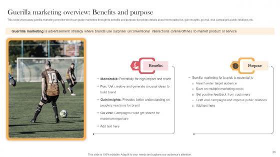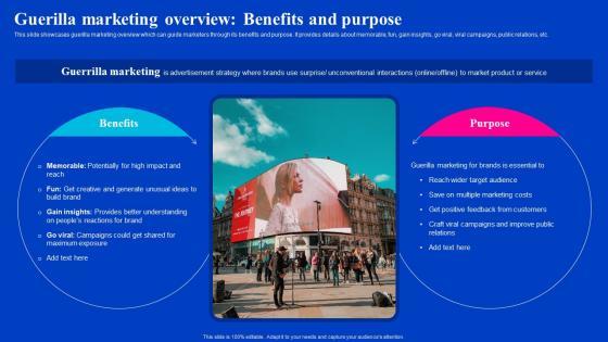 This slide showcases guerilla marketing overview which can guide marketers through its benefits and purpose. It provides details about memorable, fun, gain insights, go viral, viral campaigns, public relations, etc. Are you searching for a Guerilla Marketing Overview Benefits Viral Video Outreach Plan Icons Pdf that is uncluttered, straightforward, and original Its easy to edit, and you can change the colors to suit your personal or business branding. For a presentation that expresses how much effort you have put in, this template is ideal. With all of its features, including tables, diagrams, statistics, and lists, its perfect for a business plan presentation. Make your ideas more appealing with these professional slides. Download Guerilla Marketing Overview Benefits Viral Video Outreach Plan Icons Pdf from Slidegeeks today. This slide showcases guerilla marketing overview which can guide marketers through its benefits and purpose. It provides details about memorable, fun, gain insights, go viral, viral campaigns, public relations, etc.