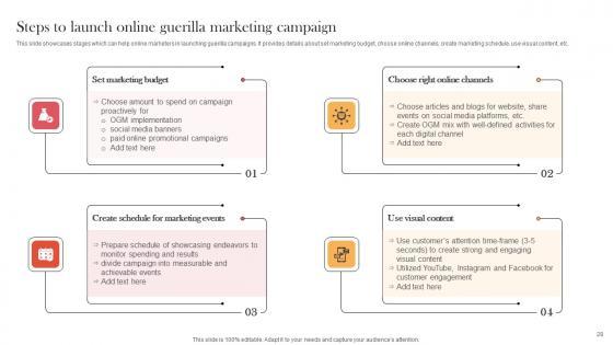This slide showcases stages which can help online marketers in launching guerilla campaigns. It provides details about set marketing budget, choose online channels, create marketing schedule, use visual content, etc. Present like a pro with Steps To Launch Online Guerilla Marketing Campaign Viral Video Outreach Plan Microsoft Pdf Create beautiful presentations together with your team, using our easy-to-use presentation slides. Share your ideas in real-time and make changes on the fly by downloading our templates. So whether you are in the office, on the go, or in a remote location, you can stay in sync with your team and present your ideas with confidence. With Slidegeeks presentation got a whole lot easier. Grab these presentations today. This slide showcases stages which can help online marketers in launching guerilla campaigns. It provides details about set marketing budget, choose online channels, create marketing schedule, use visual content, etc.
