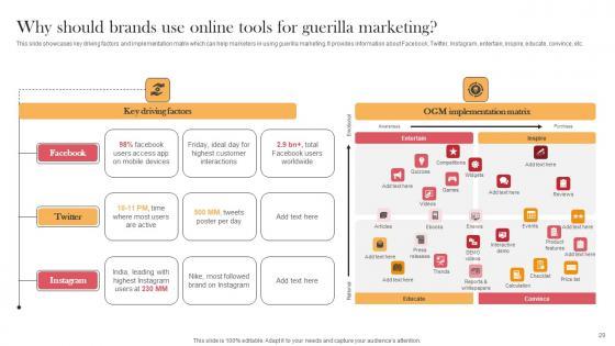 This slide showcases key driving factors and implementation matrix which can help marketers in using guerilla marketing. It provides information about Facebook, Twitter, Instagram, entertain, inspire, educate, convince, etc. This Why Should Brands Use Online Tools For Guerilla Marketing Viral Video Outreach Plan Information Pdf is perfect for any presentation, be it in front of clients or colleagues. It is a versatile and stylish solution for organizing your meetings. The product name features a modern design for your presentation meetings. The adjustable and customizable slides provide unlimited possibilities for acing up your presentation. Slidegeeks has done all the homework before launching the product for you. So, do not wait, grab the presentation templates today This slide showcases key driving factors and implementation matrix which can help marketers in using guerilla marketing. It provides information about Facebook, Twitter, Instagram, entertain, inspire, educate, convince, etc.