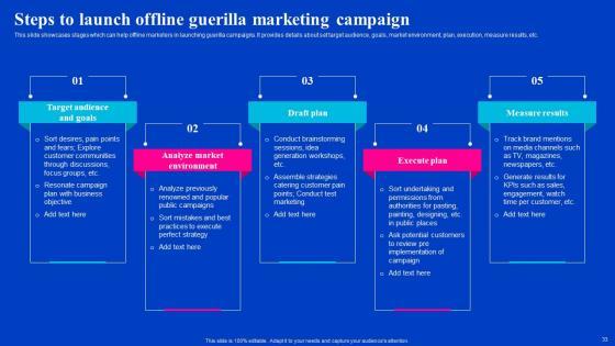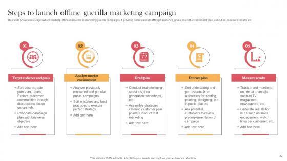This slide showcases stages which can help offline marketers in launching guerilla campaigns. It provides details about set target audience, goals, market environment, plan, execution, measure results, etc. From laying roadmaps to briefing everything in detail, our templates are perfect for you. You can set the stage with your presentation slides. All you have to do is download these easy-to-edit and customizable templates. Steps To Launch Offline Guerilla Marketing Campaign Viral Video Outreach Plan Mockup Pdf will help you deliver an outstanding performance that everyone would remember and praise you for. Do download this presentation today. This slide showcases stages which can help offline marketers in launching guerilla campaigns. It provides details about set target audience, goals, market environment, plan, execution, measure results, etc.