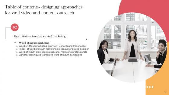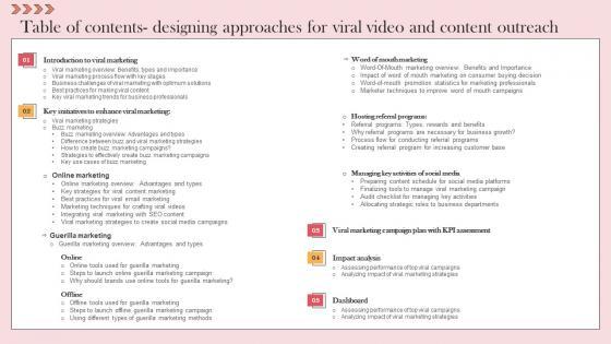 Take your projects to the next level with our ultimate collection of Table Of Contents Designing Approaches For Viral Video And Content Outreach Microsoft Pdf. Slidegeeks has designed a range of layouts that are perfect for representing task or activity duration, keeping track of all your deadlines at a glance. Tailor these designs to your exact needs and give them a truly corporate look with your own brand colors they will make your projects stand out from the rest Our Table Of Contents Designing Approaches For Viral Video And Content Outreach Microsoft Pdf are topically designed to provide an attractive backdrop to any subject. Use them to look like a presentation pro.