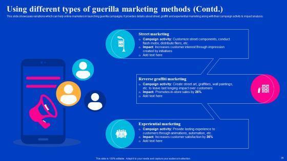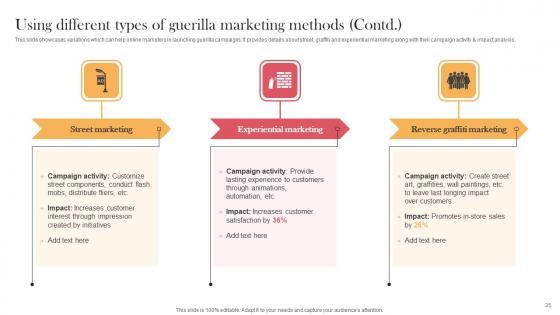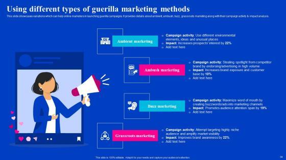 This slide showcases variations which can help online marketers in launching guerilla campaigns. It provides details about ambient, ambush, buzz, grassroots marketing along with their campaign activity and impact analysis. Whether you have daily or monthly meetings, a brilliant presentation is necessary. Using Different Types Of Guerilla Marketing Methods Viral Video Outreach Plan Themes Pdf can be your best option for delivering a presentation. Represent everything in detail using Using Different Types Of Guerilla Marketing Methods Viral Video Outreach Plan Themes Pdf and make yourself stand out in meetings. The template is versatile and follows a structure that will cater to your requirements. All the templates prepared by Slidegeeks are easy to download and edit. Our research experts have taken care of the corporate themes as well. So, give it a try and see the results. This slide showcases variations which can help online marketers in launching guerilla campaigns. It provides details about ambient, ambush, buzz, grassroots marketing along with their campaign activity and impact analysis.