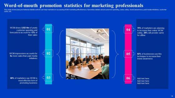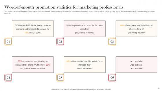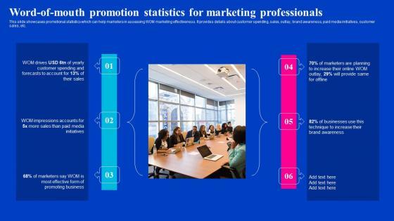 This slide showcases promotional statistics which can help marketers in assessing WOM marketing effectiveness. It provides details about customer spending, sales, outlay, brand awareness, paid media initiatives, customer sales, etc. Explore a selection of the finest Word Of Mouth Promotion Statistics Viral Video Outreach Plan Mockup Pdf here. With a plethora of professionally designed and pre-made slide templates, you can quickly and easily find the right one for your upcoming presentation. You can use our Word Of Mouth Promotion Statistics Viral Video Outreach Plan Mockup Pdf to effectively convey your message to a wider audience. Slidegeeks has done a lot of research before preparing these presentation templates. The content can be personalized and the slides are highly editable. Grab templates today from Slidegeeks. This slide showcases promotional statistics which can help marketers in assessing WOM marketing effectiveness. It provides details about customer spending, sales, outlay, brand awareness, paid media initiatives, customer sales, etc.