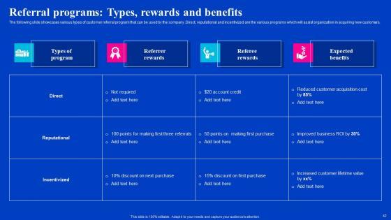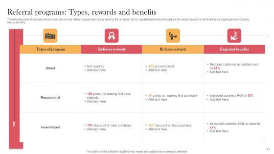 The following slide showcases various types of customer referral program that can be used by the company. Direct, reputational and incentivized are the various programs which will assist organization in acquiring new customers.Do you have to make sure that everyone on your team knows about any specific topic I yes, then you should give Referral Programs Types Rewards And Benefits Viral Video Outreach Plan Demonstration Pdf a try. Our experts have put a lot of knowledge and effort into creating this impeccable Referral Programs Types Rewards And Benefits Viral Video Outreach Plan Demonstration Pdf. You can use this template for your upcoming presentations, as the slides are perfect to represent even the tiniest detail. You can download these templates from the Slidegeeks website and these are easy to edit. So grab these today. The following slide showcases various types of customer referral program that can be used by the company. Direct, reputational and incentivized are the various programs which will assist organization in acquiring new customers.