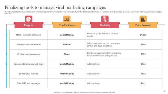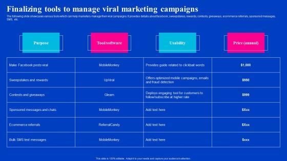 The following slide showcases various tools which can help marketers manage their viral campaigns. It provides details about facebook, sweepstakes, rewards, contests, giveaways, ecommerce referrals, sponsored messages, SMS, etc. The Finalizing Tools To Manage Viral Marketing Viral Video Outreach Plan Mockup Pdf is a compilation of the most recent design trends as a series of slides. It is suitable for any subject or industry presentation, containing attractive visuals and photo spots for businesses to clearly express their messages. This template contains a variety of slides for the user to input data, such as structures to contrast two elements, bullet points, and slides for written information. Slidegeeks is prepared to create an impression. The following slide showcases various tools which can help marketers manage their viral campaigns. It provides details about facebook, sweepstakes, rewards, contests, giveaways, ecommerce referrals, sponsored messages, SMS, etc.