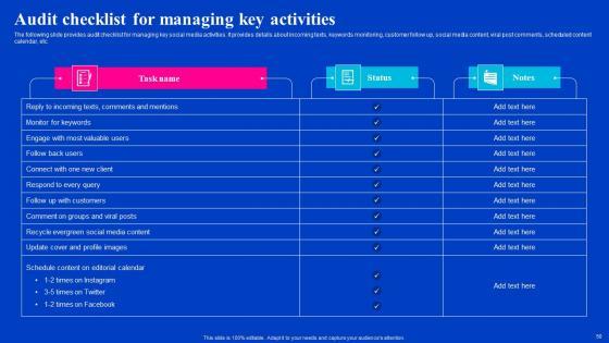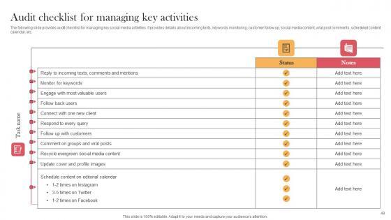 The following slide provides audit checklist for managing key social media activities. It provides details about incoming texts, keywords monitoring, customer follow up, social media content, viral post comments, scheduled content calendar, etc. Make sure to capture your audiences attention in your business displays with our gratis customizable Audit Checklist For Managing Key Activities Viral Video Outreach Plan Clipart Pdf. These are great for business strategies, office conferences, capital raising or task suggestions. If you desire to acquire more customers for your tech business and ensure they stay satisfied, create your own sales presentation with these plain slides. The following slide provides audit checklist for managing key social media activities. It provides details about incoming texts, keywords monitoring, customer follow up, social media content, viral post comments, scheduled content calendar, etc.