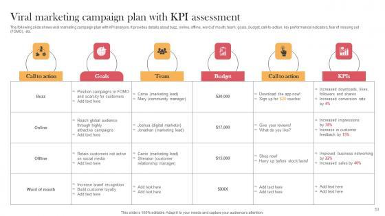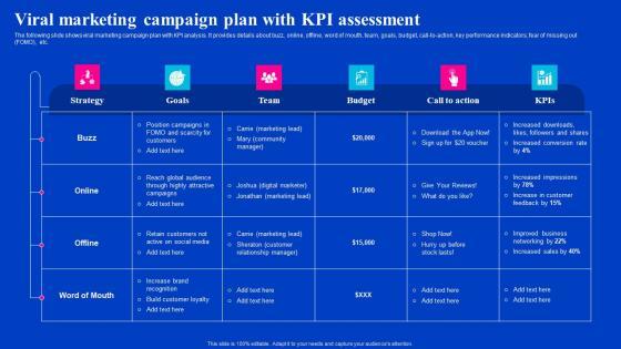 The following slide shows viral marketing campaign plan with KPI analysis. It provides details about buzz, online, offline, word of mouth, team, goals, budget, call-to-action, key performance indicators, fear of missing out FOMO, etc. If your project calls for a presentation, then Slidegeeks is your go-to partner because we have professionally designed, easy-to-edit templates that are perfect for any presentation. After downloading, you can easily edit Viral Marketing Campaign Plan With KPI Assessment Viral Video Outreach Plan Template Pdf and make the changes accordingly. You can rearrange slides or fill them with different images. Check out all the handy templates The following slide shows viral marketing campaign plan with KPI analysis. It provides details about buzz, online, offline, word of mouth, team, goals, budget, call-to-action, key performance indicators, fear of missing out FOMO, etc.