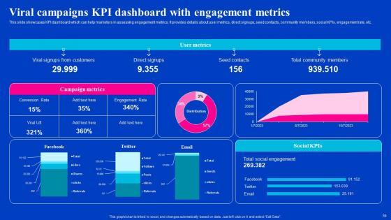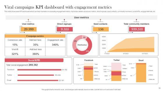 This slide showcases KPI dashboard which can help marketers in assessing engagement metrics. It provides details about user metrics, direct signups, seed contacts, community members, social KPIs, engagement rate, etc. Find highly impressive Viral Campaigns KPI Dashboard With Engagement Metrics Viral Video Outreach Plan Diagrams Pdf on Slidegeeks to deliver a meaningful presentation. You can save an ample amount of time using these presentation templates. No need to worry to prepare everything from scratch because Slidegeeks experts have already done a huge research and work for you. You need to download Viral Campaigns KPI Dashboard With Engagement Metrics Viral Video Outreach Plan Diagrams Pdf for your upcoming presentation. All the presentation templates are 100Precent editable and you can change the color and personalize the content accordingly. Download now. This slide showcases KPI dashboard which can help marketers in assessing engagement metrics. It provides details about user metrics, direct signups, seed contacts, community members, social KPIs, engagement rate, etc.