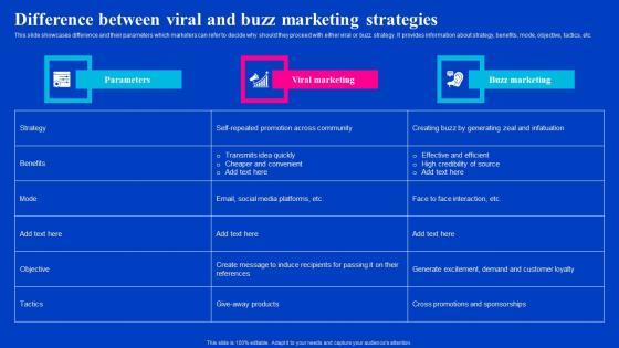 This slide showcases difference and their parameters which marketers can refer to decide why should they proceed with either viral or buzz strategy. It provides information about strategy, benefits, mode, objective, tactics, etc. The best PPT templates are a great way to save time, energy, and resources. Slidegeeks have 100Precent editable powerpoint slides making them incredibly versatile. With these quality presentation templates, you can create a captivating and memorable presentation by combining visually appealing slides and effectively communicating your message. Download Difference Between Viral And Buzz Marketing Viral Video Outreach Plan Diagrams Pdf from Slidegeeks and deliver a wonderful presentation. This slide showcases difference and their parameters which marketers can refer to decide why should they proceed with either viral or buzz strategy. It provides information about strategy, benefits, mode, objective, tactics, etc.