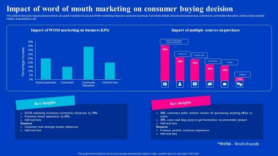 This slide showcases impact analysis which can guide marketers to assess WOM marketing impact on customer purchase. It provides details about brand awareness, conversion, community interaction, professional, website review, acquaintance, etc. Presenting this PowerPoint presentation, titled Impact Of Word Of Mouth Marketing On Viral Video Outreach Plan Clipart Pdf, with topics curated by our researchers after extensive research. This editable presentation is available for immediate download and provides attractive features when used. Download now and captivate your audience. Presenting this Impact Of Word Of Mouth Marketing On Viral Video Outreach Plan Clipart Pdf. Our researchers have carefully researched and created these slides with all aspects taken into consideration. This is a completely customizable Impact Of Word Of Mouth Marketing On Viral Video Outreach Plan Clipart Pdf that is available for immediate downloading. Download now and make an impact on your audience. Highlight the attractive features available with our PPTs. This slide showcases impact analysis which can guide marketers to assess WOM marketing impact on customer purchase. It provides details about brand awareness, conversion, community interaction, professional, website review, acquaintance, etc.