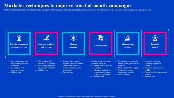 The following slide showcases marketing techniques to improve WOM campaigns. It provides details about customer service, community management, page reviews, communicate, products, services, etc. Find a pre-designed and impeccable Marketer Techniques To Improve Word Of Mouth Campaigns Viral Video Outreach Plan Background Pdf. The templates can ace your presentation without additional effort. You can download these easy-to-edit presentation templates to make your presentation stand out from others. So, what are you waiting for Download the template from Slidegeeks today and give a unique touch to your presentation. The following slide showcases marketing techniques to improve WOM campaigns. It provides details about customer service, community management, page reviews, communicate, products, services, etc.