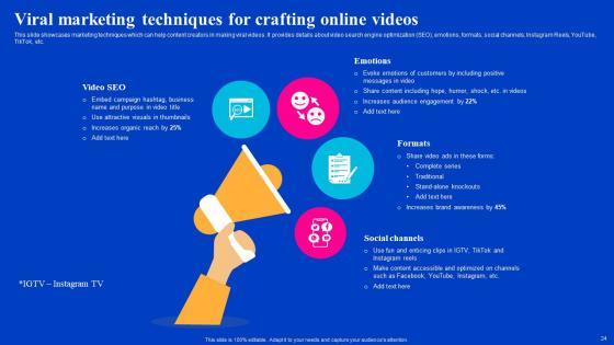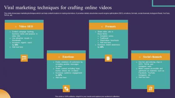 This slide showcases marketing techniques which can help content creators in making viral videos. It provides details about video search engine optimization SEO, emotions, formats, social channels, Instagram Reels, YouTube, TikTok, etc. Want to ace your presentation in front of a live audience Our Go Viral Campaign Strategies To Increase Engagement Viral Marketing Techniques Crafting Online Videos Demonstration PDF can help you do that by engaging all the users towards you. Slidegeeks experts have put their efforts and expertise into creating these impeccable powerpoint presentations so that you can communicate your ideas clearly. Moreover, all the templates are customizable, and easy to edit and downloadable. Use these for both personal and commercial use.