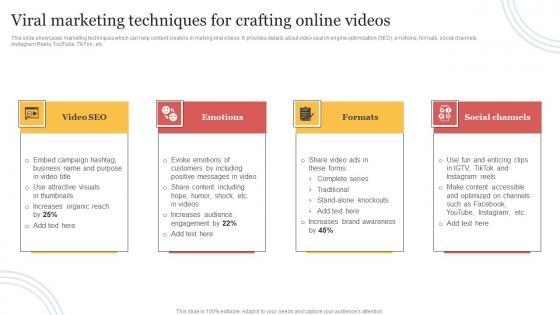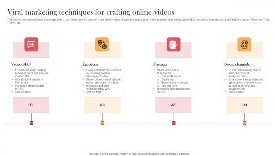 This slide showcases marketing techniques which can help content creators in making viral videos. It provides details about video search engine optimization SEO, emotions, formats, social channels, Instagram Reels, YouTube, TikTok, etc. Do you have to make sure that everyone on your team knows about any specific topic I yes, then you should give Viral Marketing Techniques For Crafting Online Videos Designing Approaches Professional Pdf a try. Our experts have put a lot of knowledge and effort into creating this impeccable Viral Marketing Techniques For Crafting Online Videos Designing Approaches Professional Pdf. You can use this template for your upcoming presentations, as the slides are perfect to represent even the tiniest detail. You can download these templates from the Slidegeeks website and these are easy to edit. So grab these today This slide showcases marketing techniques which can help content creators in making viral videos. It provides details about video search engine optimization SEO, emotions, formats, social channels, Instagram Reels, YouTube, TikTok, etc.