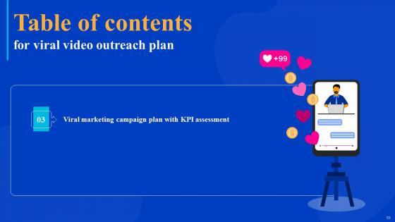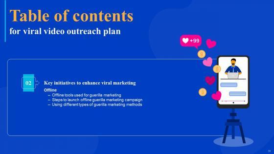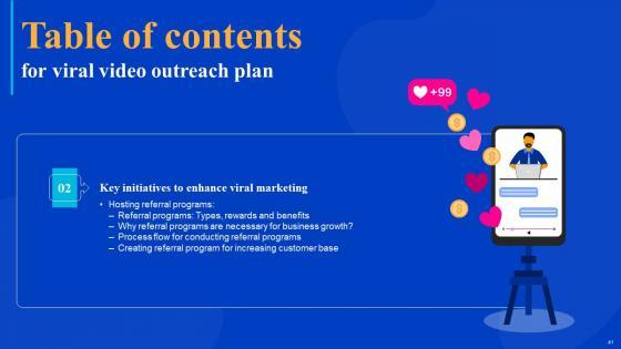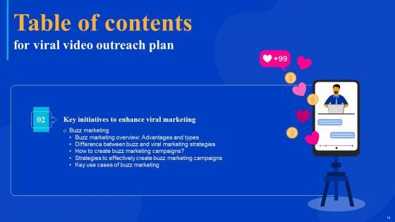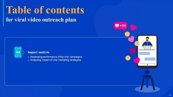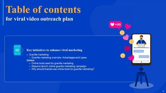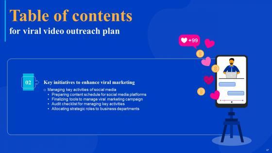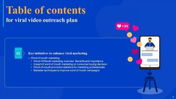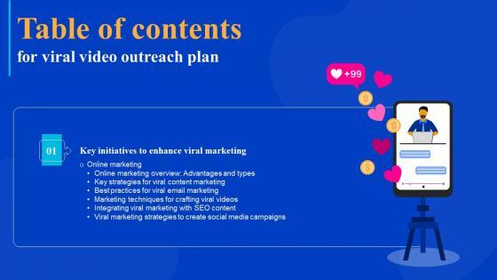 Coming up with a presentation necessitates that the majority of the effort goes into the content and the message you intend to convey. The visuals of a PowerPoint presentation can only be effective if it supplements and supports the story that is being told. Keeping this in mind our experts created Viral Video Outreach Plan Table Of Contents Slides Pdf to reduce the time that goes into designing the presentation. This way, you can concentrate on the message while our designers take care of providing you with the right template for the situation. Our Viral Video Outreach Plan Table Of Contents Slides Pdf are topically designed to provide an attractive backdrop to any subject. Use them to look like a presentation pro.