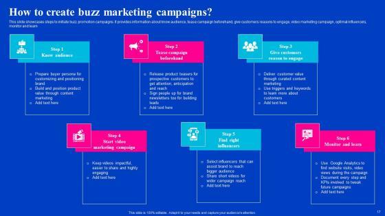 This slide showcases steps to initiate buzz promotion campaigns. It provides information about know audience, tease campaign beforehand, give customers reasons to engage, video marketing campaign, optimal influencers, monitor and learn.Retrieve professionally designed How To Create Buzz Marketing Campaigns Viral Video Outreach Plan Brochure Pdf to effectively convey your message and captivate your listeners. Save time by selecting pre-made slideshows that are appropriate for various topics, from business to educational purposes. These themes come in many different styles, from creative to corporate, and all of them are easily adjustable and can be edited quickly. Access them as PowerPoint templates or as Google Slides themes. You do not have to go on a hunt for the perfect presentation because Slidegeeks got you covered from everywhere. This slide showcases steps to initiate buzz promotion campaigns. It provides information about know audience, tease campaign beforehand, give customers reasons to engage, video marketing campaign, optimal influencers, monitor and learn.