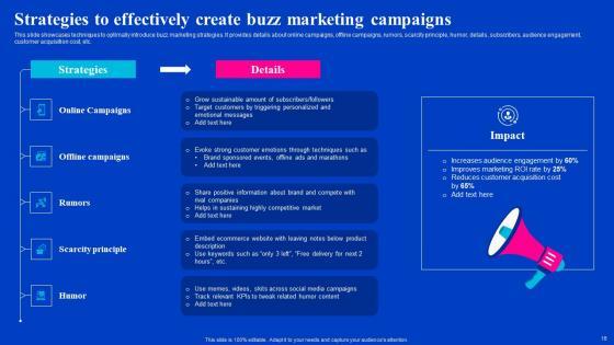 This slide showcases techniques to optimally introduce buzz marketing strategies. It provides details about online campaigns, offline campaigns, rumors, scarcity principle, humor, details, subscribers, audience engagement, customer acquisition cost, etc. Slidegeeks is here to make your presentations a breeze with Strategies To Effectively Create Buzz Marketing Campaigns Viral Video Outreach Plan Rules Pdf With our easy-to-use and customizable templates, you can focus on delivering your ideas rather than worrying about formatting. With a variety of designs to choose from, you are sure to find one that suits your needs. And with animations and unique photos, illustrations, and fonts, you can make your presentation pop. So whether you are giving a sales pitch or presenting to the board, make sure to check out Slidegeeks first. This slide showcases techniques to optimally introduce buzz marketing strategies. It provides details about online campaigns, offline campaigns, rumors, scarcity principle, humor, details, subscribers, audience engagement, customer acquisition cost, etc.