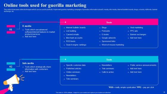 This slide showcases online techniques which can be used to perfectly implement guerilla marketing campaigns. It provides information about E-media, Info media, internet bulletin boards, blogs, e-books, AdWords, banner exchange, etc. Slidegeeks is one of the best resources for PowerPoint templates. You can download easily and regulate Online Tools Used For Guerilla Marketing Viral Video Outreach Plan Themes Pdf for your personal presentations from our wonderful collection. A few clicks is all it takes to discover and get the most relevant and appropriate templates. Use our Templates to add a unique zing and appeal to your presentation and meetings. All the slides are easy to edit and you can use them even for advertisement purposes. This slide showcases online techniques which can be used to perfectly implement guerilla marketing campaigns. It provides information about E-media, Info media, internet bulletin boards, blogs, e-books, AdWords, banner exchange, etc.