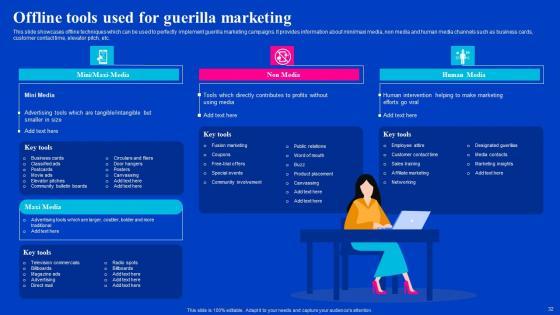 This slide showcases offline techniques which can be used to perfectly implement guerilla marketing campaigns. It provides information about miniormaxi media, non media and human media channels such as business cards, customer contact time, elevator pitch, etc. Boost your pitch with our creative Offline Tools Used For Guerilla Marketing Viral Video Outreach Plan Slides Pdf. Deliver an awe-inspiring pitch that will mesmerize everyone. Using these presentation templates you will surely catch everyones attention. You can browse the ppts collection on our website. We have researchers who are experts at creating the right content for the templates. So you do not have to invest time in any additional work. Just grab the template now and use them. This slide showcases offline techniques which can be used to perfectly implement guerilla marketing campaigns. It provides information about miniormaxi media, non media and human media channels such as business cards, customer contact time, elevator pitch, etc.