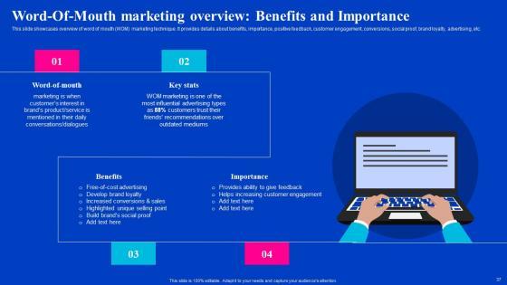 This slide showcases overview of word of mouth WOM marketing technique. It provides details about benefits, importance, positive feedback, customer engagement, conversions, social proof, brand loyalty, advertising, etc. Welcome to our selection of the Word Of Mouth Marketing Overview Benefits And Importance Viral Video Outreach Plan Download Pdf. These are designed to help you showcase your creativity and bring your sphere to life. Planning and Innovation are essential for any business that is just starting out. This collection contains the designs that you need for your everyday presentations. All of our PowerPoints are 100Precent editable, so you can customize them to suit your needs. This multi-purpose template can be used in various situations. Grab these presentation templates today. This slide showcases overview of word of mouth WOM marketing technique. It provides details about benefits, importance, positive feedback, customer engagement, conversions, social proof, brand loyalty, advertising, etc.