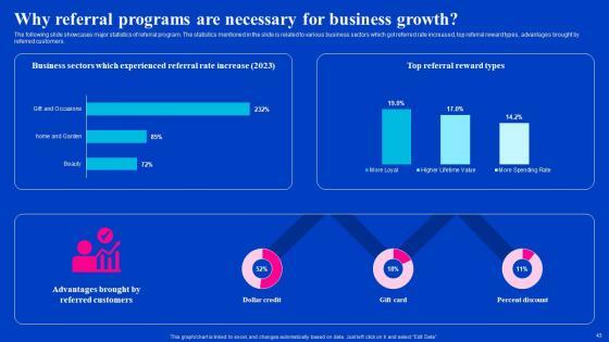 The following slide showcases major statistics of referral program. The statistics mentioned in the slide is related to various business sectors which got referred rate increased, top referral reward types, advantages brought by referred customers.This modern and well-arranged Why Referral Programs Are Necessary For Business Growth Viral Video Outreach Plan Information Pdf provides lots of creative possibilities. It is very simple to customize and edit with the Powerpoint Software. Just drag and drop your pictures into the shapes. All facets of this template can be edited with Powerpoint no extra software is necessary. Add your own material, put your images in the places assigned for them, adjust the colors, and then you can show your slides to the world, with an animated slide included. The following slide showcases major statistics of referral program. The statistics mentioned in the slide is related to various business sectors which got referred rate increased, top referral reward types, advantages brought by referred customers.
