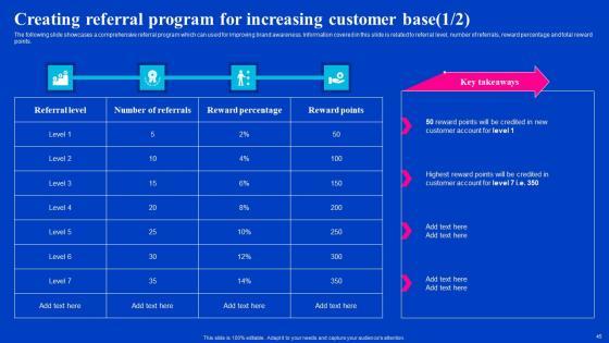 The following slide showcases a comprehensive referral program which can used for improving brand awareness. Information covered in this slide is related to referral level, number of referrals, reward percentage and total reward points.Welcome to our selection of the Creating Referral Program For Increasing Viral Video Outreach Plan Graphics Pdf. These are designed to help you showcase your creativity and bring your sphere to life. Planning and Innovation are essential for any business that is just starting out. This collection contains the designs that you need for your everyday presentations. All of our PowerPoints are 100Precent editable, so you can customize them to suit your needs. This multi-purpose template can be used in various situations. Grab these presentation templates today. The following slide showcases a comprehensive referral program which can used for improving brand awareness. Information covered in this slide is related to referral level, number of referrals, reward percentage and total reward points.