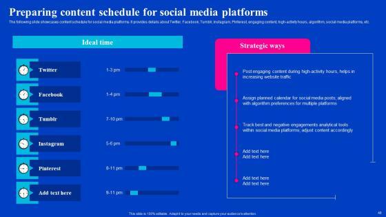 The following slide showcases content schedule for social media platforms. It provides details about Twitter, Facebook, Tumblr, Instagram, Pinterest, engaging content, high-activity hours, algorithm, social media platforms, etc. Want to ace your presentation in front of a live audience Our Preparing Content Schedule For Social Media Platforms Viral Video Outreach Plan Microsoft Pdf can help you do that by engaging all the users towards you.. Slidegeeks experts have put their efforts and expertise into creating these impeccable powerpoint presentations so that you can communicate your ideas clearly. Moreover, all the templates are customizable, and easy-to-edit and downloadable. Use these for both personal and commercial use. The following slide showcases content schedule for social media platforms. It provides details about Twitter, Facebook, Tumblr, Instagram, Pinterest, engaging content, high-activity hours, algorithm, social media platforms, etc.