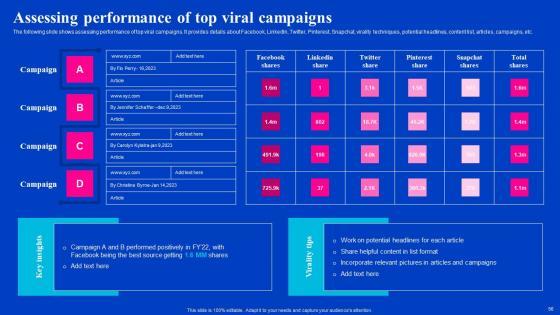 The following slide shows assessing performance of top viral campaigns. It provides details about Facebook, LinkedIn, Twitter, Pinterest, Snapchat, virality techniques, potential headlines, content list, articles, campaigns, etc. Crafting an eye-catching presentation has never been more straightforward. Let your presentation shine with this tasteful yet straightforward Assessing Performance Of Top Viral Campaigns Viral Video Outreach Plan Rules Pdf template. It offers a minimalistic and classy look that is great for making a statement. The colors have been employed intelligently to add a bit of playfulness while still remaining professional. Construct the ideal Assessing Performance Of Top Viral Campaigns Viral Video Outreach Plan Rules Pdf that effortlessly grabs the attention of your audience. Begin now and be certain to wow your customers. The following slide shows assessing performance of top viral campaigns. It provides details about Facebook, LinkedIn, Twitter, Pinterest, Snapchat, virality techniques, potential headlines, content list, articles, campaigns, etc.