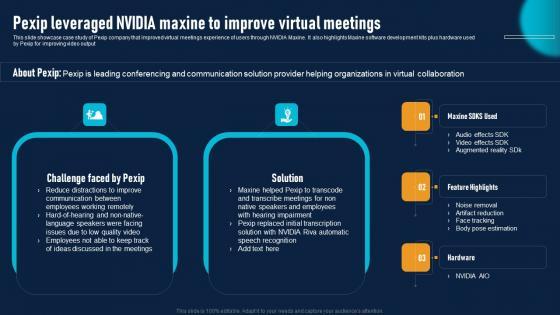 This slide showcase case study of Pexip company that improved virtual meetings experience of users through NVIDIA Maxine. It also highlights Maxine software development kits plus hardware used by Pexip for improving video output Make sure to capture your audiences attention in your business displays with our gratis customizable Pexip Leveraged NVIDIA Maxine NVIDIA AI To Improve Virtual Communication Experience Microsoft Pdf. These are great for business strategies, office conferences, capital raising or task suggestions. If you desire to acquire more customers for your tech business and ensure they stay satisfied, create your own sales presentation with these plain slides. This slide showcase case study of Pexip company that improved virtual meetings experience of users through NVIDIA Maxine. It also highlights Maxine software development kits plus hardware used by Pexip for improving video output