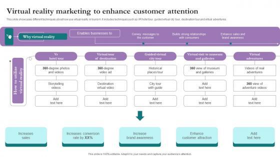 This slide showcases different techniques about how use virtual reality in tourism. It includes techniques such as VR hotel tour, guided virtual city tour, destination tour and virtual adventures. Are you in need of a template that can accommodate all of your creative concepts This one is crafted professionally and can be altered to fit any style. Use it with Google Slides or PowerPoint. Include striking photographs, symbols, depictions, and other visuals. Fill, move around, or remove text boxes as desired. Test out color palettes and font mixtures. Edit and save your work, or work with colleagues. Download Virtual Reality Marketing To Enhance Customer Attention Effective Travel Marketing Guide For Improving Background PDF and observe how to make your presentation outstanding. Give an impeccable presentation to your group and make your presentation unforgettable.