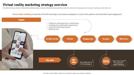 This slide showcases overview of virtual reality marketing strategy. It provides information about augmented reality AR, test drive, AR changing rooms, fun games, market size, brand stories, etc.Are you searching for a Implementing Experimental Marketing Virtual Reality Marketing Strategy Overview Microsoft PDF that is uncluttered, straightforward, and original Its easy to edit, and you can change the colors to suit your personal or business branding. For a presentation that expresses how much effort you ve put in, this template is ideal With all of its features, including tables, diagrams, statistics, and lists, its perfect for a business plan presentation. Make your ideas more appealing with these professional slides. Download Implementing Experimental Marketing Virtual Reality Marketing Strategy Overview Microsoft PDF from Slidegeeks today.