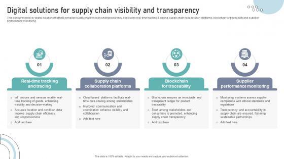 This slide presents key digital solutions that help enhance supply chain visibility and transparency. It includes real-time tracking and tracing, supply chain collaboration platforms, blockchain for traceability and supplier performance monitoring.This Digital Solutions For Supply Chain Visibility And Transparency DT SS V is perfect for any presentation, be it in front of clients or colleagues. It is a versatile and stylish solution for organizing your meetings. The Digital Solutions For Supply Chain Visibility And Transparency DT SS V features a modern design for your presentation meetings. The adjustable and customizable slides provide unlimited possibilities for acing up your presentation. Slidegeeks has done all the homework before launching the product for you. So, do not wait, grab the presentation templates today This slide presents key digital solutions that help enhance supply chain visibility and transparency. It includes real-time tracking and tracing, supply chain collaboration platforms, blockchain for traceability and supplier performance monitoring.