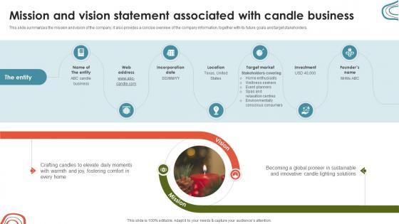 This slide summarizes the mission and vision of the company, it also provides a concise overview of the company information, together with its future goals and target stakeholders. The Candle Business Venture Mission And Vision Statement Associated With Candle BP SS V is a compilation of the most recent design trends as a series of slides. It is suitable for any subject or industry presentation, containing attractive visuals and photo spots for businesses to clearly express their messages. This template contains a variety of slides for the user to input data, such as structures to contrast two elements, bullet points, and slides for written information. Slidegeeks is prepared to create an impression. This slide summarizes the mission and vision of the company, it also provides a concise overview of the company information, together with its future goals and target stakeholders.