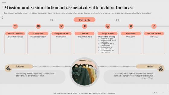 This slide summarizes the mission and vision of the company, it also provides a concise overview of the company, together with its entity name, web address, location, initial investement and target stakeholders. Slidegeeks has constructed Mission And Vision Statement Associated Fashion Startup Roadmap Plan Ppt Example BP SS V after conducting extensive research and examination. These presentation templates are constantly being generated and modified based on user preferences and critiques from editors. Here, you will find the most attractive templates for a range of purposes while taking into account ratings and remarks from users regarding the content. This is an excellent jumping-off point to explore our content and will give new users an insight into our top-notch PowerPoint Templates. This slide summarizes the mission and vision of the company, it also provides a concise overview of the company, together with its entity name, web address, location, initial investement and target stakeholders.