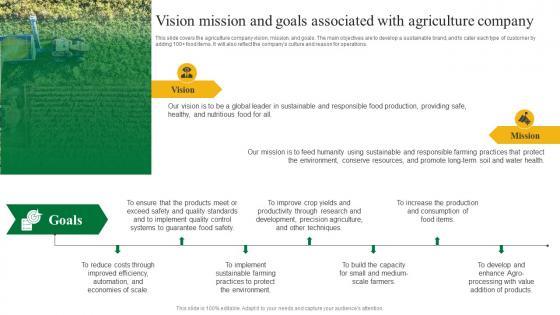 This slide covers the agriculture company vision, mission, and goals. The main objectives are to develop a sustainable brand, and to cater each type of customer by adding 100 food items. It will also reflect the companys culture and reason for operations. Want to ace your presentation in front of a live audience Our Vision Mission And Goals Associated Agriculture Business Plan Go To Market Strategy Icons Pdf can help you do that by engaging all the users towards you. Slidegeeks experts have put their efforts and expertise into creating these impeccable powerpoint presentations so that you can communicate your ideas clearly. Moreover, all the templates are customizable, and easy to edit and downloadable. Use these for both personal and commercial use. This slide covers the agriculture company vision, mission, and goals. The main objectives are to develop a sustainable brand, and to cater each type of customer by adding 100 food items. It will also reflect the companys culture and reason for operations.