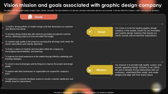 This slide covers the graphic design company vision, mission, and goals. The main objectives is to develop a stronger relationships with the local community. It will also reflect the companys culture and reason for operations. Want to ace your presentation in front of a live audience Our Creative Agency Business Plan Vision Mission And Goals Associated With Graphic Design BP SS V can help you do that by engaging all the users towards you. Slidegeeks experts have put their efforts and expertise into creating these impeccable powerpoint presentations so that you can communicate your ideas clearly. Moreover, all the templates are customizable, and easy-to-edit and downloadable. Use these for both personal and commercial use. This slide covers the graphic design company vision, mission, and goals. The main objectives is to develop a stronger relationships with the local community. It will also reflect the companys culture and reason for operations.