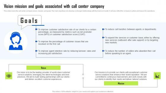 This slide covers the call center company vision, mission, and goals. The main objectives is to develop a stronger relationships with the local community. It will also reflect the companys culture and reason for operations. Do you have an important presentation coming up Are you looking for something that will make your presentation stand out from the rest Look no further than Vision Mission And Goals Associated With Call Center IT And Tech Support Business Diagrams Pdf With our professional designs, you can trust that your presentation will pop and make delivering it a smooth process. And with Slidegeeks, you can trust that your presentation will be unique and memorable. So why wait Grab Vision Mission And Goals Associated With Call Center IT And Tech Support Business Diagrams Pdf today and make your presentation stand out from the rest. This slide covers the call center company vision, mission, and goals. The main objectives is to develop a stronger relationships with the local community. It will also reflect the companys culture and reason for operations.
