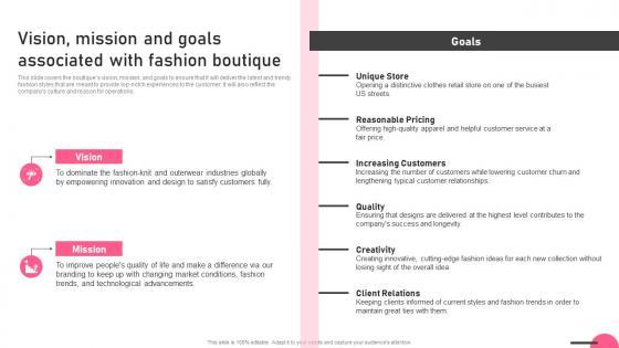 This slide covers the boutiques vision, mission, and goals to ensure that it will deliver the latest and trendy fashion styles that are meant to provide top-notch experiences to the customer. It will also reflect the companys culture and reason for operations. There are so many reasons you need a Vision Mission And Goals Associated With Fashion Boutique Boutique Business Ideas Pdf. The first reason is you can not spend time making everything from scratch, Thus, Slidegeeks has made presentation templates for you too. You can easily download these templates from our website easily. This slide covers the boutiques vision, mission, and goals to ensure that it will deliver the latest and trendy fashion styles that are meant to provide top-notch experiences to the customer. It will also reflect the companys culture and reason for operations.