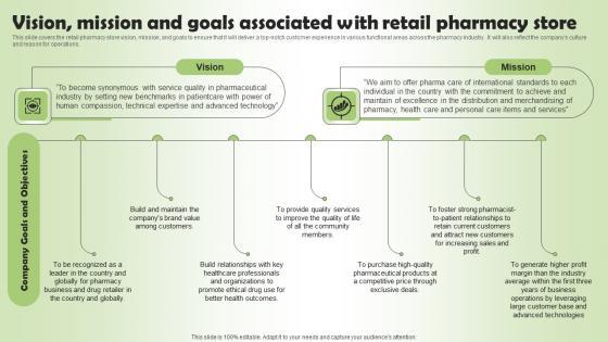This slide covers the retail pharmacy store vision, mission, and goals to ensure that it will deliver a top notch customer experience in various functional areas across the pharmacy industry. It will also reflect the companys culture and reason for operations. Boost your pitch with our creative Vision Mission And Goals Associated With Retail Pharmacy Business Plan Go To Market Strategy Topics Pdf. Deliver an awe inspiring pitch that will mesmerize everyone. Using these presentation templates you will surely catch everyones attention. You can browse the ppts collection on our website. We have researchers who are experts at creating the right content for the templates. So you do not have to invest time in any additional work. Just grab the template now and use them. This slide covers the retail pharmacy store vision, mission, and goals to ensure that it will deliver a top notch customer experience in various functional areas across the pharmacy industry. It will also reflect the companys culture and reason for operations.