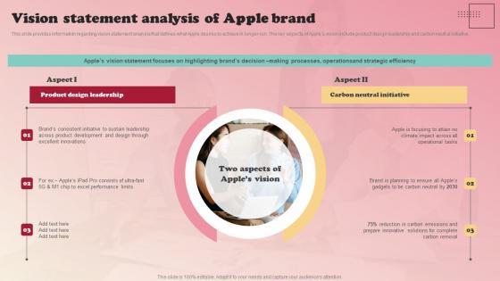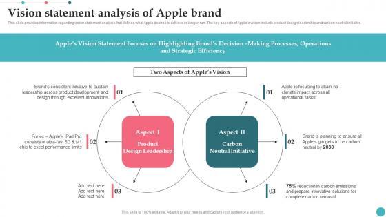 This slide provides information regarding vision statement analysis that defines what Apple desires to achieve in longer run. The key aspects of Apples vision include product design leadership and carbon neutral initiative. Retrieve professionally designed Vision Statement Analysis Of Apple Brand Mockup PDF to effectively convey your message and captivate your listeners. Save time by selecting pre made slideshows that are appropriate for various topics, from business to educational purposes. These themes come in many different styles, from creative to corporate, and all of them are easily adjustable and can be edited quickly. Access them as PowerPoint templates or as Google Slides themes. You do not have to go on a hunt for the perfect presentation because Slidegeeks got you covered from everywhere.