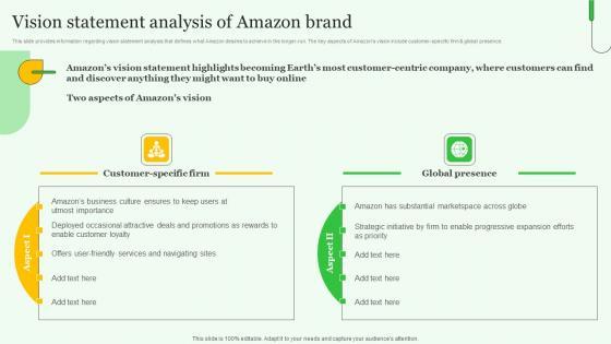 This slide provides information regarding vision statement analysis that defines what Amazon desires to achieve in the longer-run. The key aspects of Amazons vision include customer-specific firm and global presence. Crafting an eye-catching presentation has never been more straightforward. Let your presentation shine with this tasteful yet straightforward Vision Statement Analysis Of Amazon Brand Template PDF template. It offers a minimalistic and classy look that is great for making a statement. The colors have been employed intelligently to add a bit of playfulness while still remaining professional. Construct the ideal Vision Statement Analysis Of Amazon Brand Template PDF that effortlessly grabs the attention of your audience Begin now and be certain to wow your customers