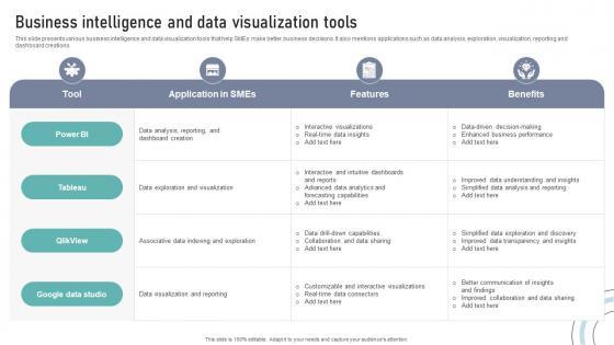 This slide presents various business intelligence and data visualization tools that help SMEs make better business decisions. It also mentions applications such as data analysis, exploration, visualization, reporting and dashboard creations.Present like a pro with Business Intelligence And Data Visualization Tools DT SS V. Create beautiful presentations together with your team, using our easy-to-use presentation slides. Share your ideas in real-time and make changes on the fly by downloading our templates. So whether you are in the office, on the go, or in a remote location, you can stay in sync with your team and present your ideas with confidence. With Slidegeeks presentation got a whole lot easier. Grab these presentations today. This slide presents various business intelligence and data visualization tools that help SMEs make better business decisions. It also mentions applications such as data analysis, exploration, visualization, reporting and dashboard creations.