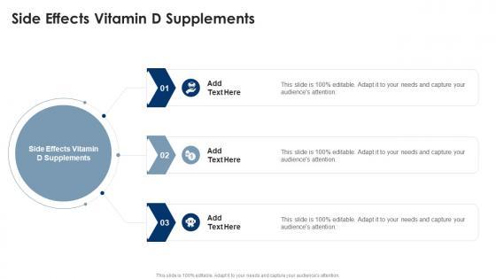 Introducing our well designed Side Effects Vitamin D Supplements In Powerpoint And Google Slides Cpb This PowerPoint design presents information on topics like Side Effects Vitamin D Supplements As it is predesigned it helps boost your confidence level. It also makes you a better presenter because of its high quality content and graphics. This PPT layout can be downloaded and used in different formats like PDF, PNG, and JPG. Not only this, it is available in both Standard Screen and Widescreen aspect ratios for your convenience. Therefore, click on the download button now to persuade and impress your audience. Our Side Effects Vitamin D Supplements In Powerpoint And Google Slides Cpb are topically designed to provide an attractive backdrop to any subject. Use them to look like a presentation pro.