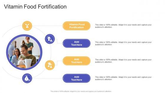 Introducing our well designed Vitamin Food Fortification In Powerpoint And Google Slides Cpb. This PowerPoint design presents information on topics like Vitamin Food Fortification. As it is predesigned it helps boost your confidence level. It also makes you a better presenter because of its high-quality content and graphics. This PPT layout can be downloaded and used in different formats like PDF, PNG, and JPG. Not only this, it is available in both Standard Screen and Widescreen aspect ratios for your convenience. Therefore, click on the download button now to persuade and impress your audience. Our Vitamin Food Fortification In Powerpoint And Google Slides Cpb are topically designed to provide an attractive backdrop to any subject. Use them to look like a presentation pro.