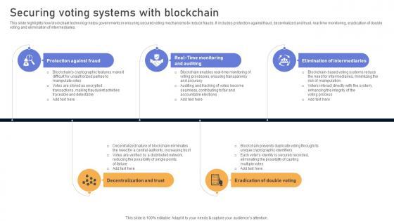 This slide highlights how blockchain technology helps governments in ensuring secured voting mechanisms to reduce frauds. It includes protection against fraud, decentralized and trust, real time monitoring, eradication of double voting and elimination of intermediaries. From laying roadmaps to briefing everything in detail, our templates are perfect for you. You can set the stage with your presentation slides. All you have to do is download these easy-to-edit and customizable templates. Visionary Guide To Blockchain Securing Voting Systems With Blockchain BCT SS V will help you deliver an outstanding performance that everyone would remember and praise you for. Do download this presentation today. This slide highlights how blockchain technology helps governments in ensuring secured voting mechanisms to reduce frauds. It includes protection against fraud, decentralized and trust, real time monitoring, eradication of double voting and elimination of intermediaries.