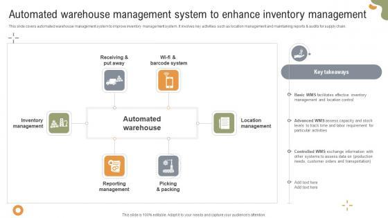 This slide covers automated warehouse management system to improve inventory management system. It involves key activities such as location management and maintaining reports and audits for supply chain. Want to ace your presentation in front of a live audience Our Implementing Strategies To Enhance Automated Warehouse Management System To Enhance can help you do that by engaging all the users towards you. Slidegeeks experts have put their efforts and expertise into creating these impeccable powerpoint presentations so that you can communicate your ideas clearly. Moreover, all the templates are customizable, and easy-to-edit and downloadable. Use these for both personal and commercial use. This slide covers automated warehouse management system to improve inventory management system. It involves key activities such as location management and maintaining reports and audits for supply chain.