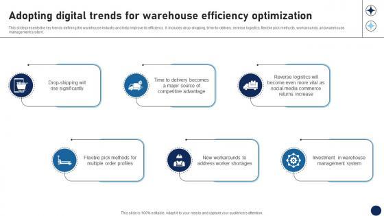 This slide presents the key trends defining the warehouse industry and help improve its efficiency. It includes drop-shipping, time-to-delivery, reverse logistics, flexible pick methods, workarounds, and warehouse management system.Slidegeeks is one of the best resources for PowerPoint templates. You can download easily and regulate Adopting Digital Trends For Warehouse Efficiency Optimizing Retail Operations With Digital DT SS V for your personal presentations from our wonderful collection. A few clicks is all it takes to discover and get the most relevant and appropriate templates. Use our Templates to add a unique zing and appeal to your presentation and meetings. All the slides are easy to edit and you can use them even for advertisement purposes. This slide presents the key trends defining the warehouse industry and help improve its efficiency. It includes drop-shipping, time-to-delivery, reverse logistics, flexible pick methods, workarounds, and warehouse management system.