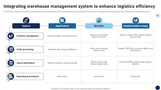 This slide showcases how companies can integrate warehouse management system to improve efficiency of businesses. It includes inventory management, order processing, space optimization, and reporting and analysis.Slidegeeks is one of the best resources for PowerPoint templates. You can download easily and regulate Integrating Warehouse Management System To Enhance Logistics Efficiency for your personal presentations from our wonderful collection. A few clicks is all it takes to discover and get the most relevant and appropriate templates. Use our Templates to add a unique zing and appeal to your presentation and meetings. All the slides are easy to edit and you can use them even for advertisement purposes. This slide showcases how companies can integrate warehouse management system to improve efficiency of businesses. It includes inventory management, order processing, space optimization, and reporting and analysis.
